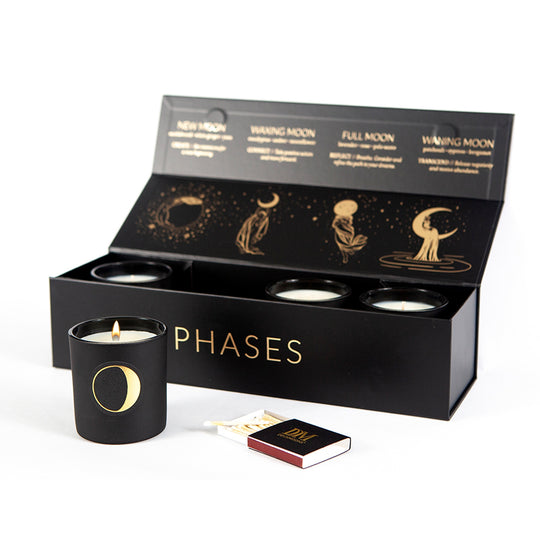 The PHASES set includes 4 of our signature highly scented soy-blend candles, packaged in a lux black box with gold-embossed original artwork on the outside of the box. Lifting the magnetic lid reveals our original artwork representing each phase, along with the scent notes and guiding intention. Each candle is protected by a dust cover embossed with the corresponding moon phase. The PHASES set is a perfect gift for the modern mystic and conscious creator